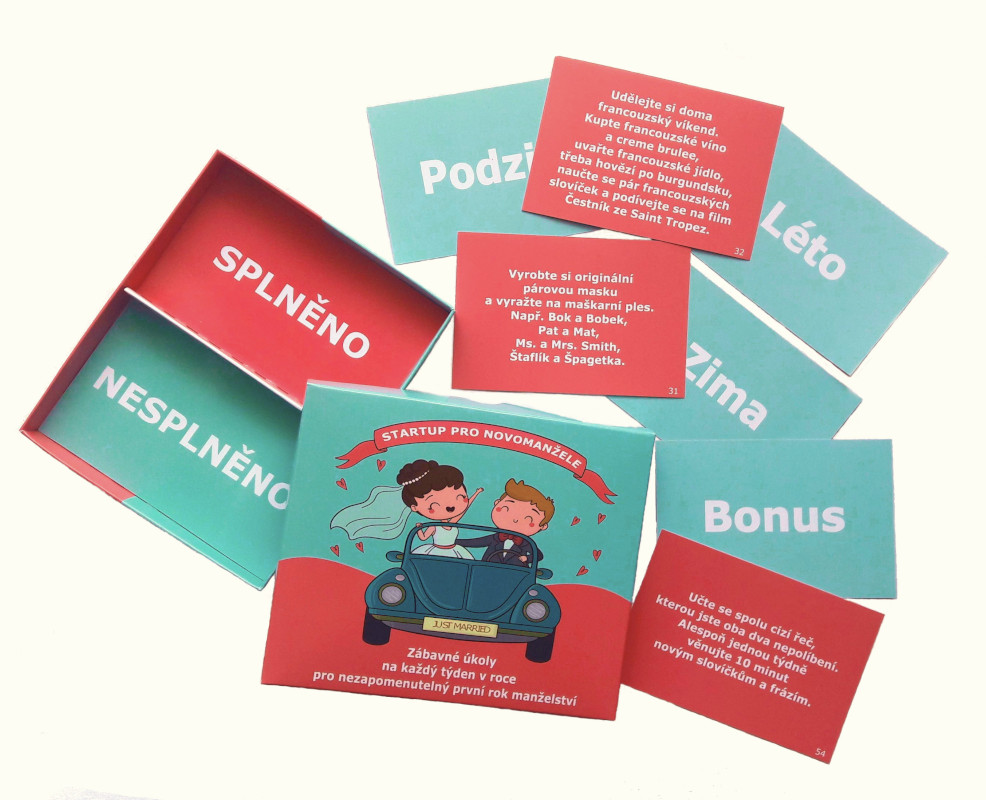 V krabičce se nachází celkem 60 kartiček se zábavnými úkoly – 54 z nich je rozděleno podle čtyř ročních období na jaro, léto, podzim a zimu a 6 je bonusových (roční období jsou pouze doporučujícím časovým ukazatelem pro plnění aktivit). Bonusové úkoly jsou dlouhodobé a manželé je mohou plnit celý rok nebo ještě lépe, celý život.